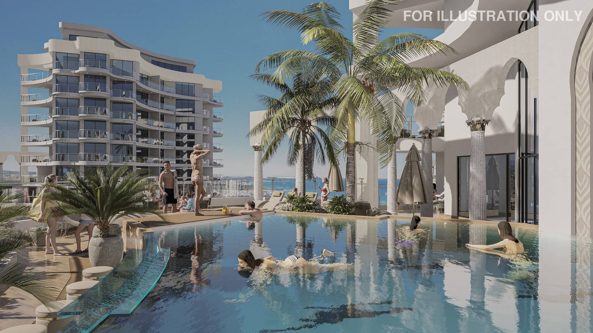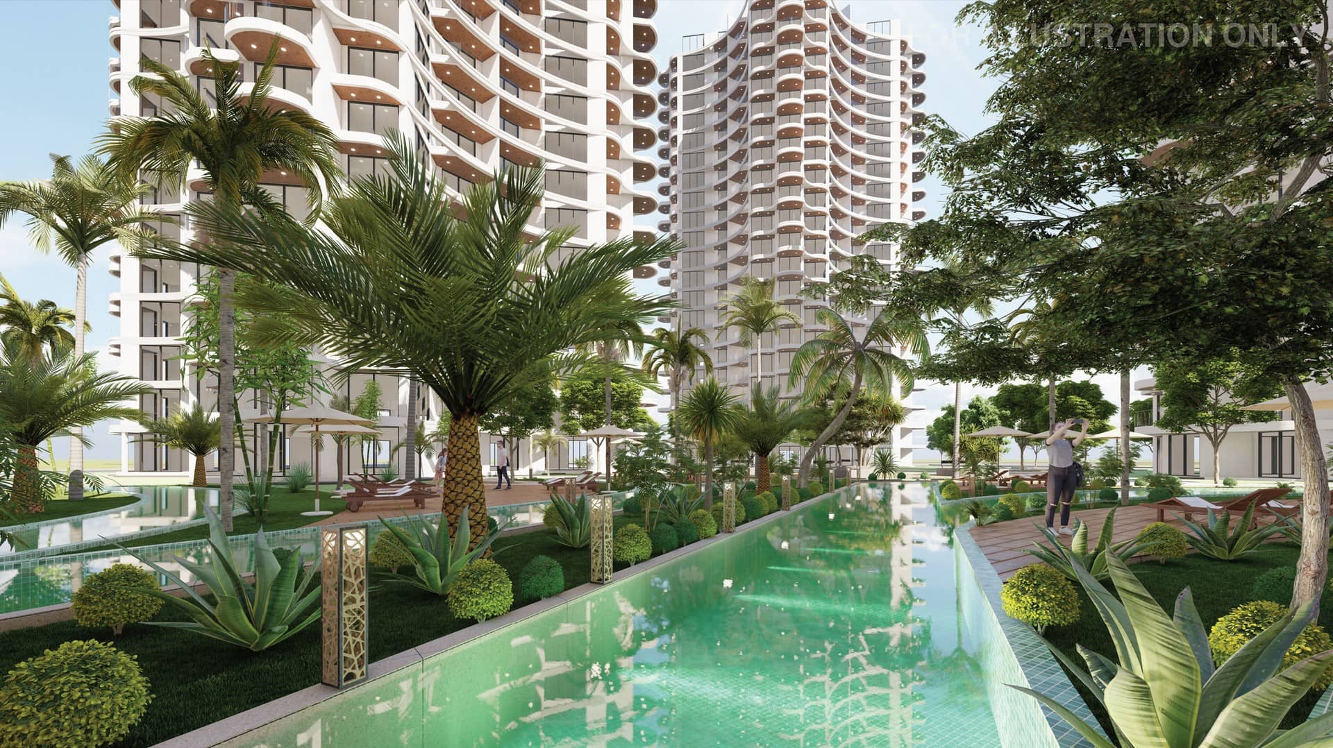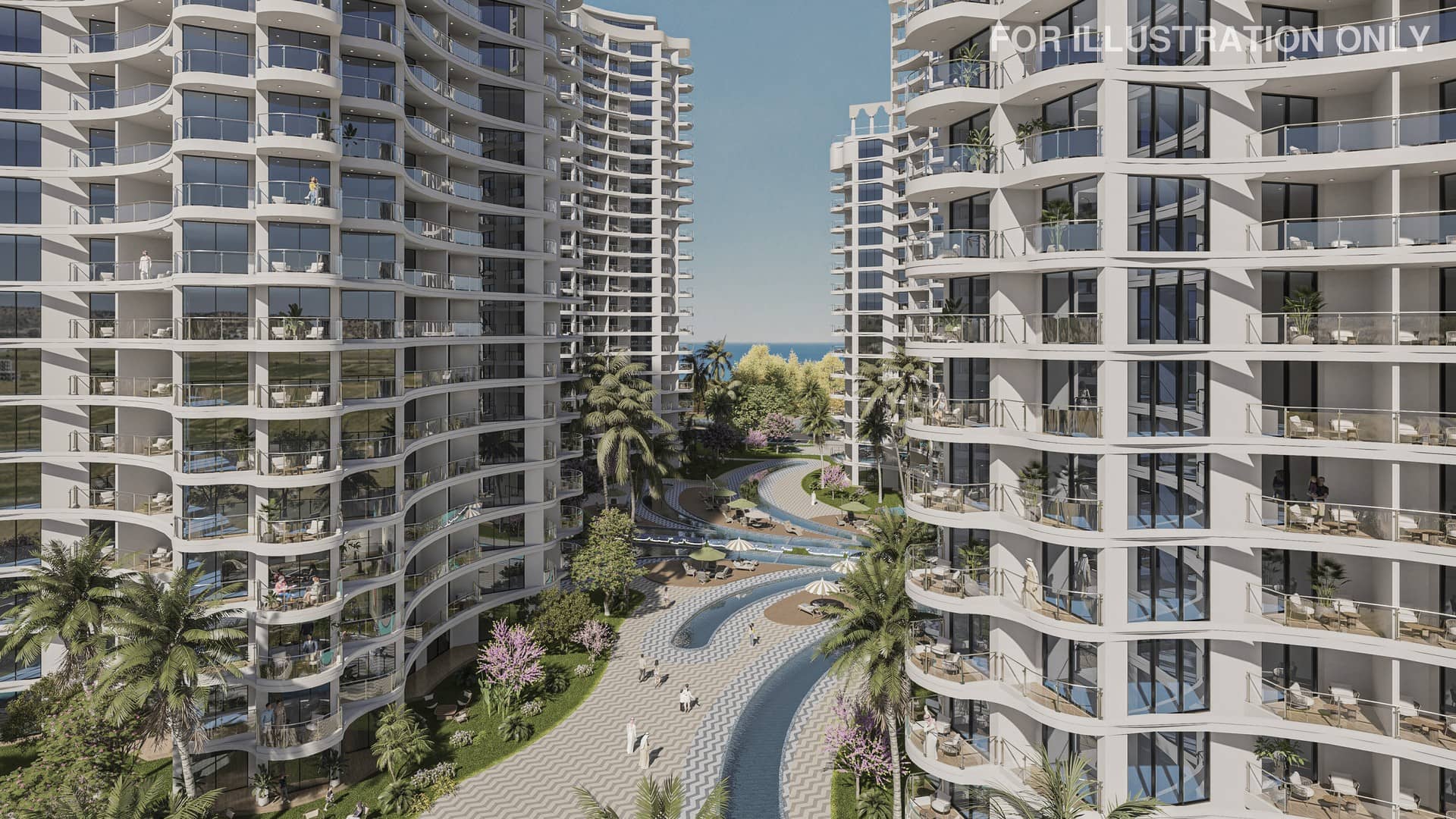 Just 300 meters from the sea, it includes exceptional design inspired by the best architecture of Dubai, modern facilities, a huge palm-shaped communal pool and private pools at each building.