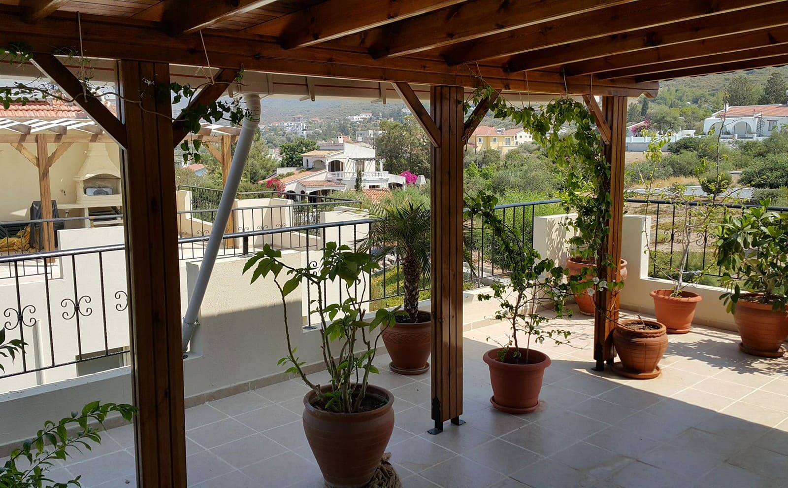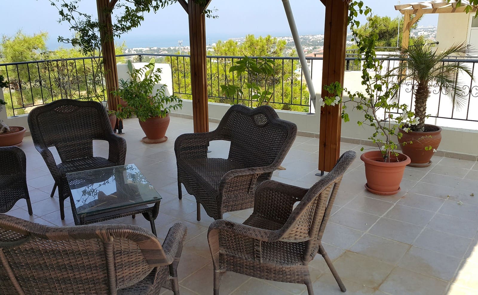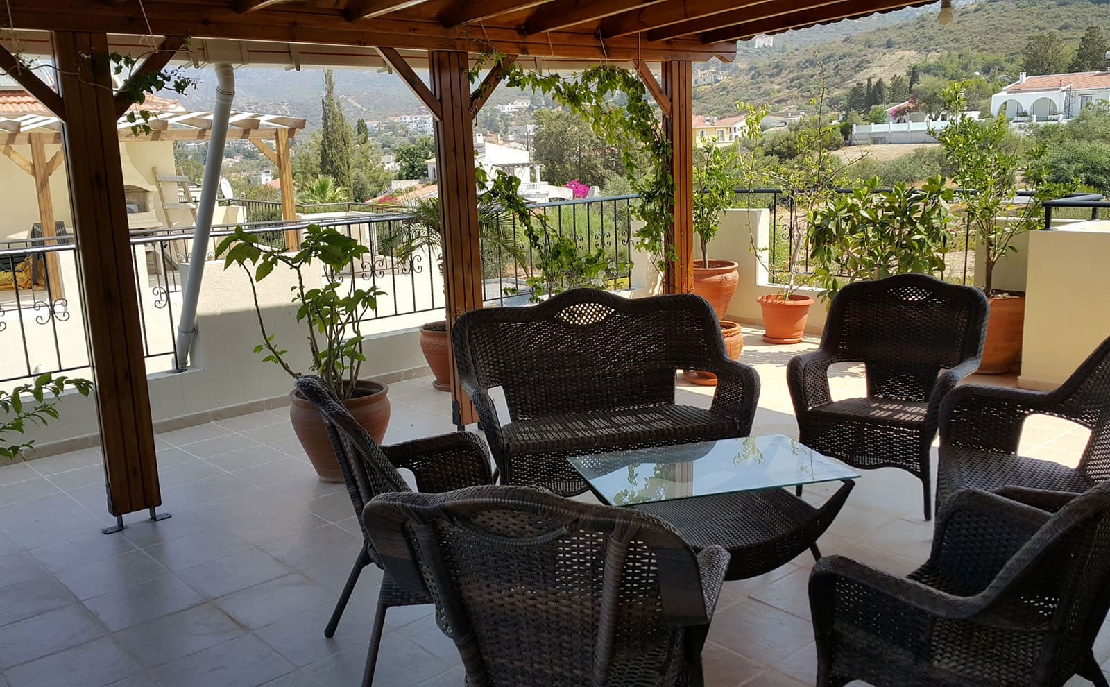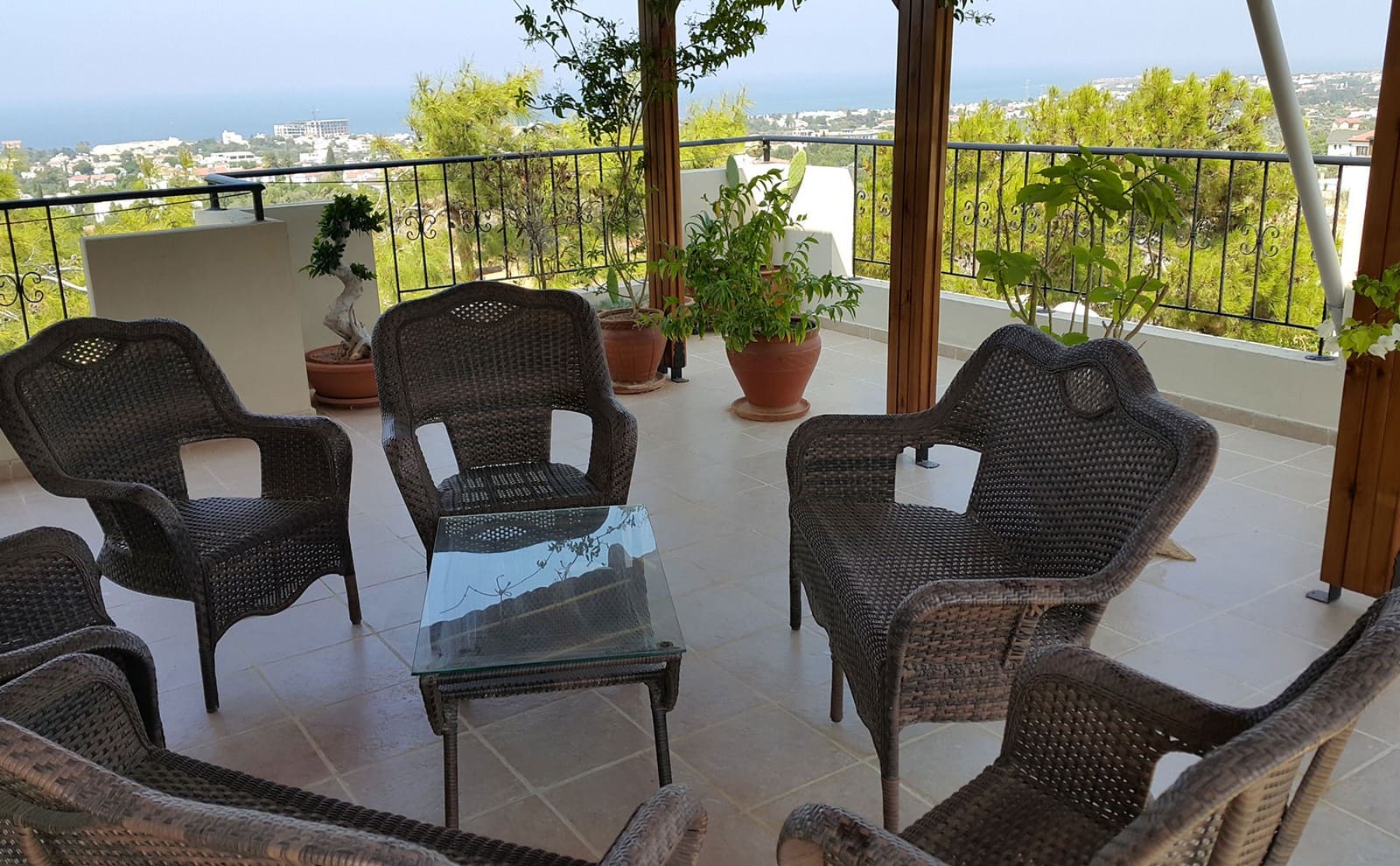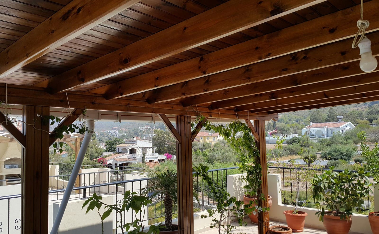 - великолепная, крытая терраса (50 м2) на крыше с умопомрачительными полностью открытыми видами на горы и море. Терраса обшита деревом и покрыта корабельным лаком